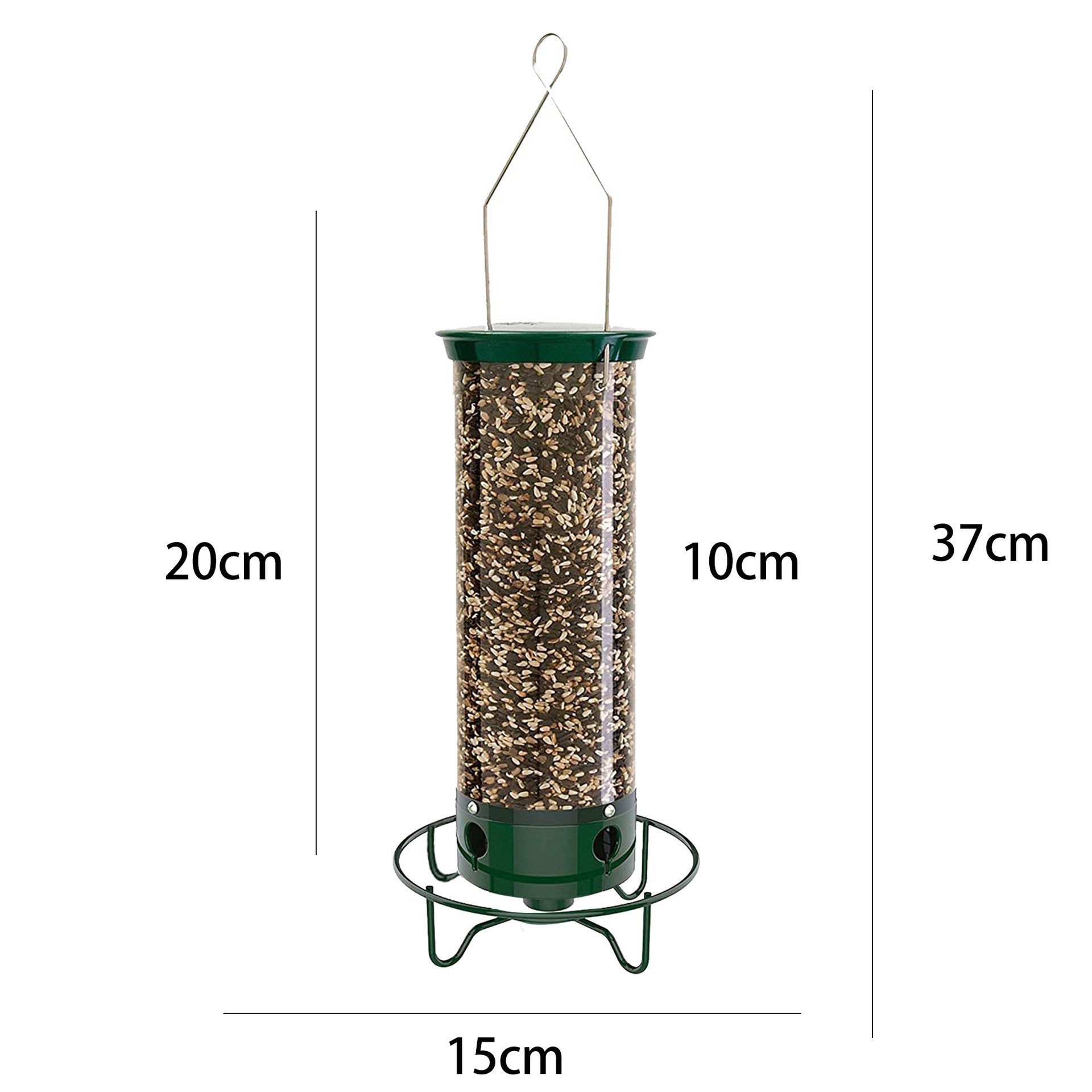 Bird feeder is constructed of iron base and cap , PVC transparent cylinder. The seed tube is UV-stabilized polycarbonate and won't fade