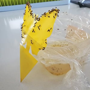 Get a cup or glass and put a tablespoon of apple cider vinegar or balsamic vinegar or wine orange juice and the yellow plates in it and place the cups in different places in the kitchen. Then wait a few hours. The traps will be like a magnet. Fruit fly infestation solved!