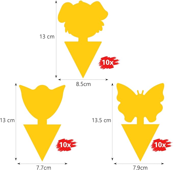 Pack of 30 yellow boards in different cute patterns. Simply peel off the white protective paper and slide into the potting soil of the plant. Then it's just waiting for.