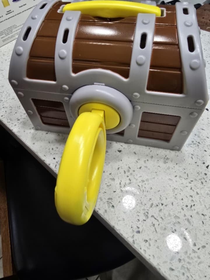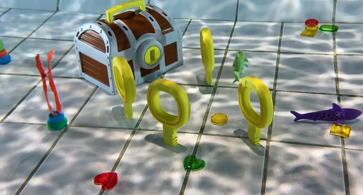 The way we've been playing is - The keys are in the pool, so they have to dive after them but the chest is on the patio - where it's easier for the kids to access the lock and the choice of toy.