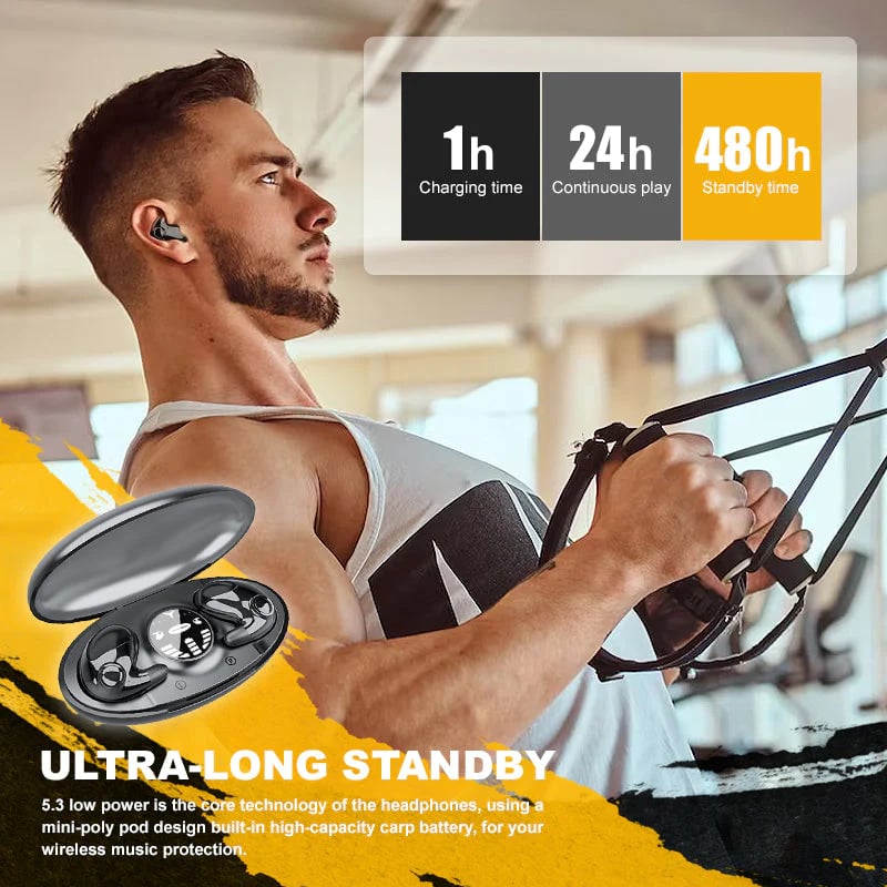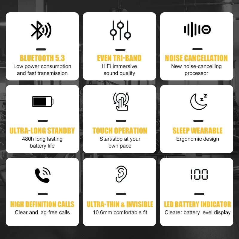 Invisible Design & Ergonomics Invisible earbuds are designed according to the shape of the ear, very mini design style, very light, fit the ear hook securely, suitable for long-term wear, will not cause discomfort to the ear.