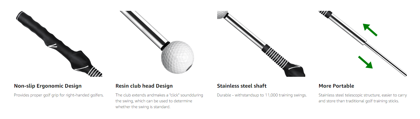 • 【Retractable Golf Swing Trainer】Our golf swing trainer with retractable and sound design provides a realistic swing feeling. When you swing down, the club will extend and make a "click" sound to determine whether your swing is standard, which can improve your swing rhythm,balance, flexibility, speed and power.