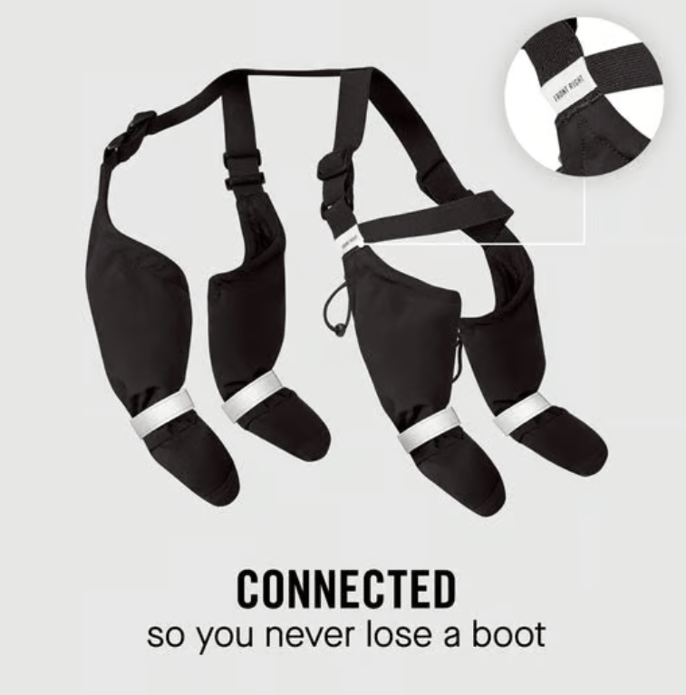 They’re adjustable and connected dog boots, which means you’ll never lose a boot. They’re also easy to layer with your favorite outerwear to stay clean and dry. (4 dog boots connected to each other)